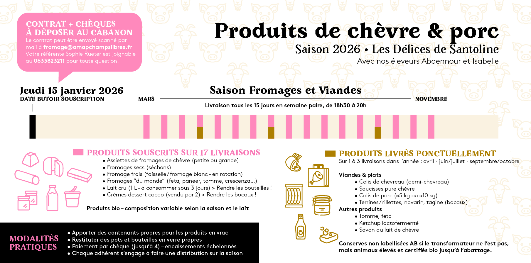 La saison 2025 est ouverte aux inscriptions. Vous pouvez remplir le contrat joint et nous le retourner par mail ou nous l’ammener lors d’une distribution. Si vous êtes intéressé, vous pouvez nous contacter (lien) |